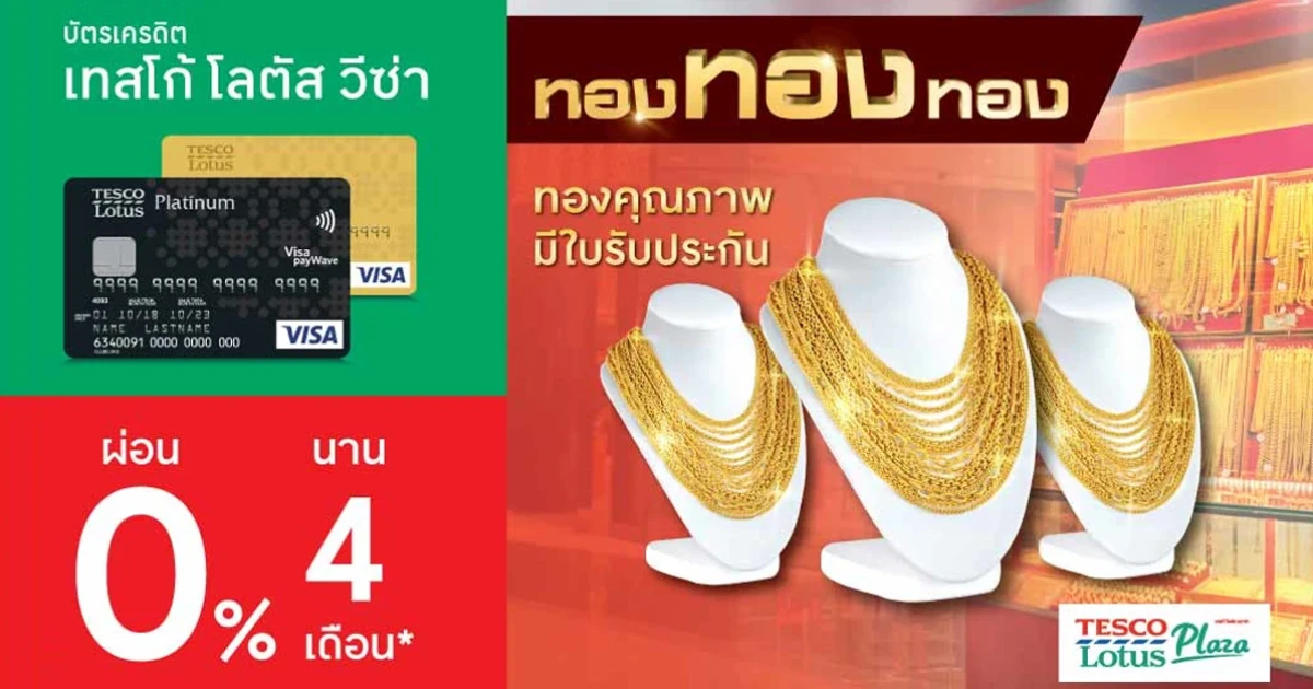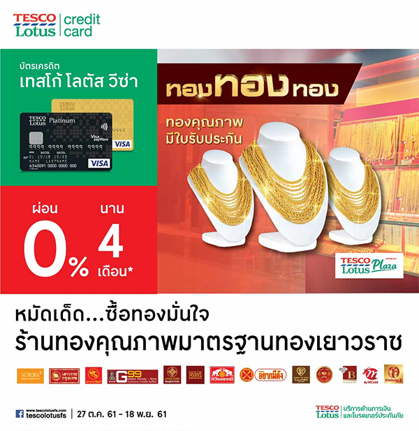 - สิทธิพิเศษผ่อนทอง 0% นาน 4 เดือน สำหรับลูกค้าที่ผ่อนชำระที่ห้างทองที่ร่วมรายการในเทสโก้ โลตัส เท่านั้น