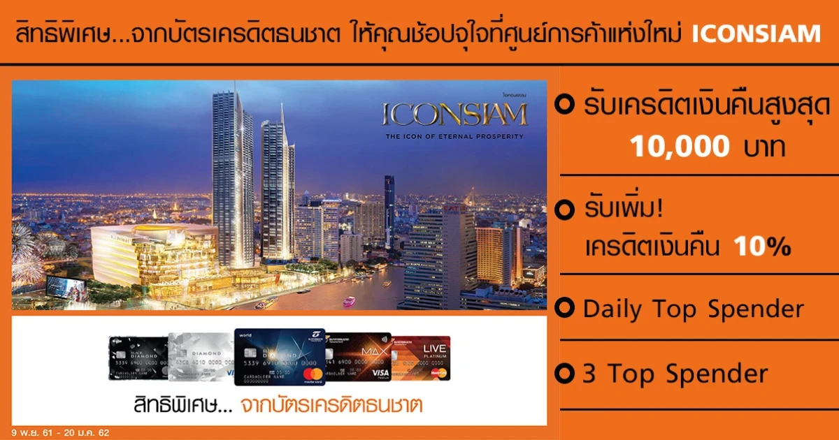 สิทธิพิเศษ...จาก บัตรเครดิตธนชาต ให้คุณช้อปจุใจที่ศูนย์การค้าแห่งใหม่ ICONSIAM ให้คุณรับทั้งเครดิตเงินคืน, บัตรกำนัล, หรือคะแนนพิเศษ
