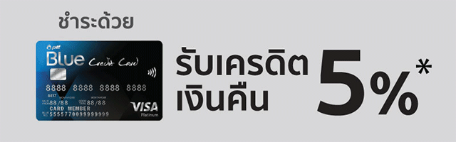 - สงวนสิทธิ์เฉพาะผู้ถือบัตร PTT Blue Credit Card ที่ลงทะเบียน SMS และได้รับข้อความยืนยันจากระบบตอบกลับแล้ว