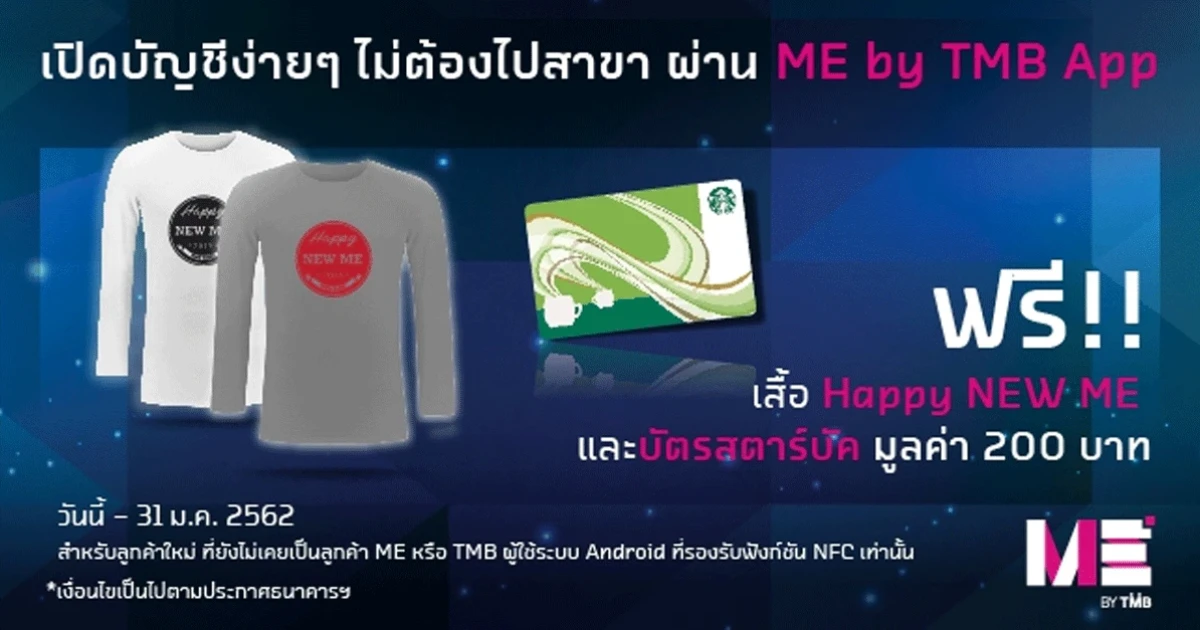 เปิดบัญชีง่ายๆ ไม่ต้องไปสาขาผ่าน ME by TMB App รับฟรี!! เสื้อ Happy NEW ME และบัตรสตาร์บัค