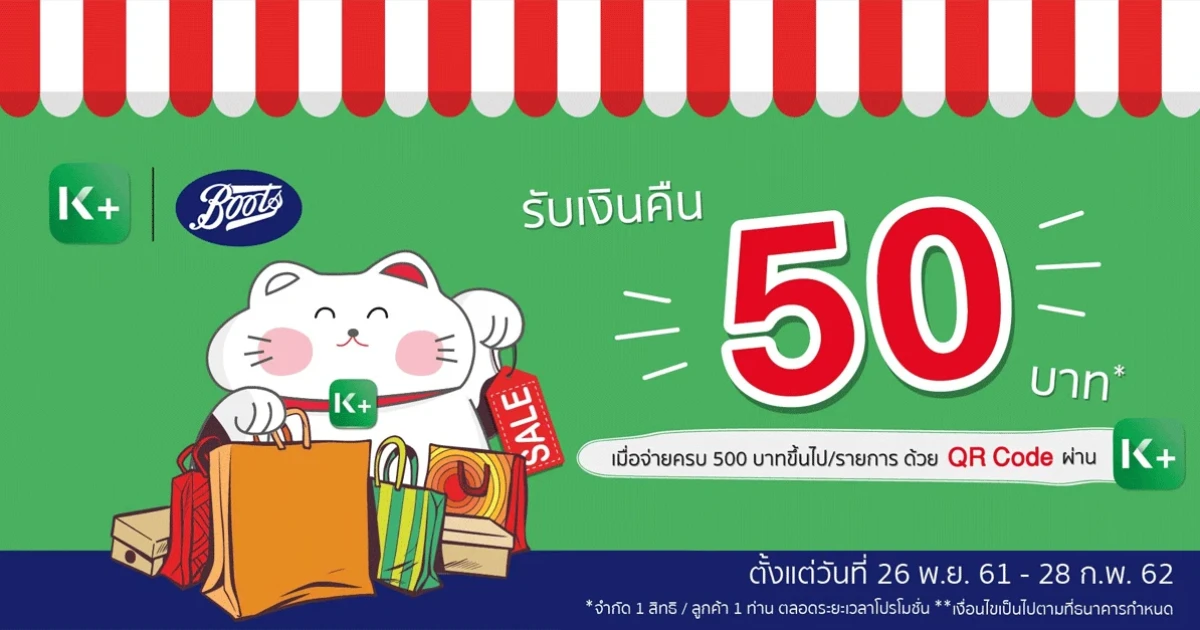 รับสิทธิพิเศษจ่าย 500 บาท รับเงินคืน 50 บาท ลูกค้าที่ชำระค่าสินค้าด้วย QR Code ผ่านแอปพลิเคชัน K PLUS ของธนาคารกสิกรไทย ที่ร้านบู๊ทส์ทั่วประเทศ