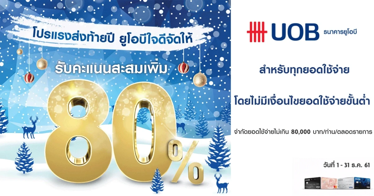 โปรแรงส่งท้ายปี บัตรเครดิตยูโอบี ใจดีจัดให้ รับคะแนนสะสมเพิ่ม 80% สำหรับทุกยอดใช้จ่าย โดยไม่มีเงื่อนไขยอดใช้จ่ายขั้นต่ำ (จำกัดยอดใช้จ่ายไม่เกิน 80,000 บาท/ท่าน/ตลอดรายการ)
