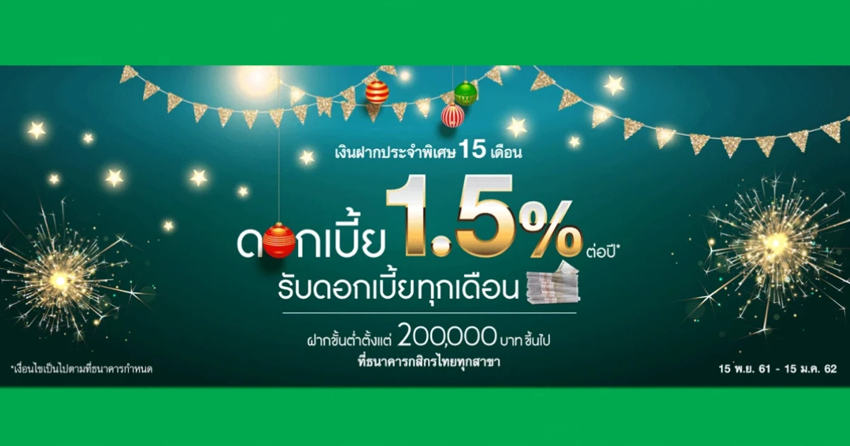 ใครๆ ก็เก็บเงินให้งอกเงยได้ กับ บัญชีเงินฝากประจำพิเศษ 15 เดือน จากธนาคารกสิกรไทย สำหรับลูกค้าบุคคลธรรมดาที่มีอายุตั้งแต่ 15 ปีบริบูรณ์ขึ้นไป วัด มูลนิธิ สภากาชาดไทย และลูกค้าที่มีข้อตกลงกับธนาคารเป็นกรณีพิเศษ วงเงินเปิดบัญชีขั้นต่ำ 200,000 บาท และธนาคารจะโอนดอกเบี้ยเข้าบัญชีเงินฝากอัตโนมัติทุกเดือน