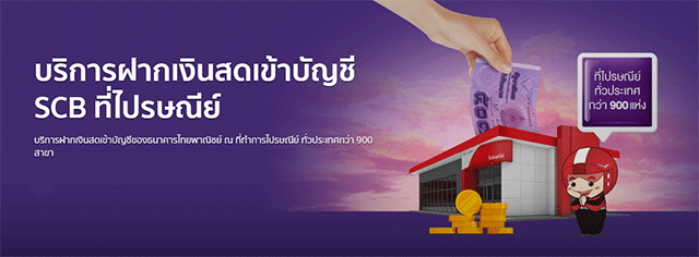 เพิ่มความสะดวก ง่าย ใกล้ๆ คุณ โดยเฉพาะในพื้นที่ที่ไม่มีสาขา หรือตู้ฝากเงิน (CDM) ของธนาคารไทยพาณิชย์ให้บริการอยู่ ด้วยช่องทางให้บริการใหม่ในการฝากเงินสดเขาบัญชีออมทรัพย์ และกระแสรายวันของธนาคารไทยพาณิชย์ กับบริการทำธุรกรรมทางการเงินผ่านตัวแทนของธนาคาร (Banking Agent) ซึ่งมีบริษัท ไปรษณีย์ไทย จำกัด (ปณท) ที่มีเครือข่ายสาขาครอบคลุมทั่วประเทศร่วมเป็นพันธมิตร