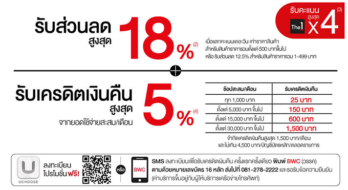 - จำกัดเครดิตเงินคืนสูงสุด 1,500 บาท ต่อเดือน และไม่เกิน 4,500 บาท ต่อบัญชีบัตรหลักตลอดรายการ