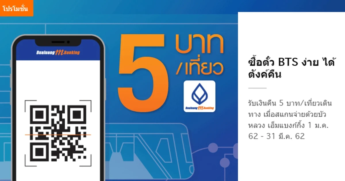 โปรโมชั่นพิเศษจาก ธนาคารกรุงเทพ รับเงินคืน 5 บาท/เที่ยวเดินทาง เมื่อซื้อตั๋ว BTS และสแกน QR CODE ชำระค่าตั๋วด้วยบัวหลวง เอ็มแบงก์กิ้ง