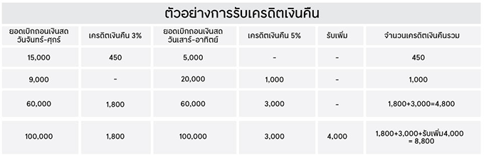 - รับเครดิตเงินคืน 3% เมื่อเบิกถอนเงินสดสะสม 8,000 บาทขึ้นไป วันจันทร์ - ศุกร์