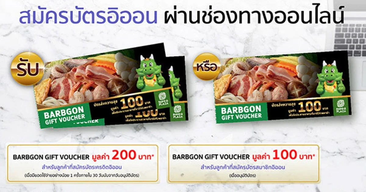 - รับบัตรกำนัล บาร์บีคิวพลาซ่า มูลค่า 200 บาท