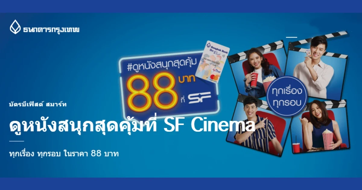 ดูหนังสนุกสุดคุ้มที่ SF Cinema ทุกเรื่อง ทุกรอบ ในราคา 88 บาท เมื่อจ่ายผ่านบัตรบีเฟิสต์ ธ.กรุงเทพ