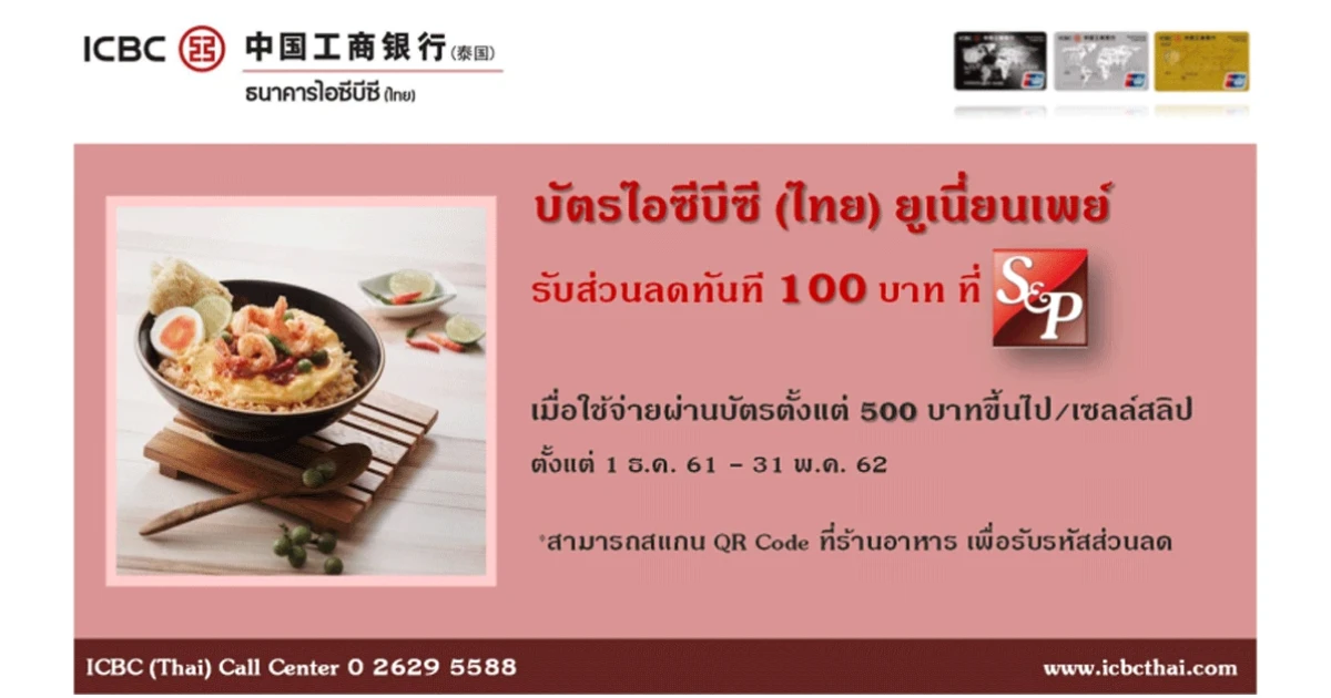 ลูกค้าบัตรเครดิตไอซีบีซี (ไทย) รับส่วนลดทันที 100 บาท เมื่อรับประทานอาหารครบ 500 บาท ที่ S&P