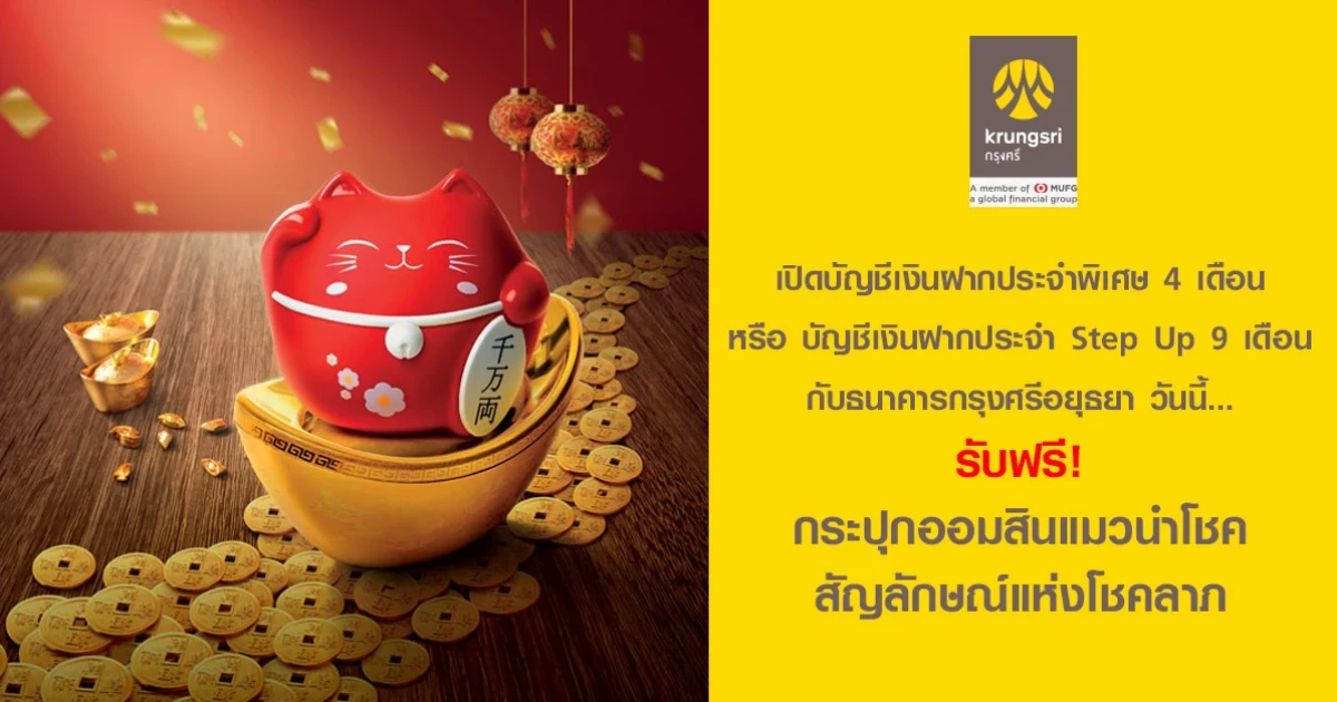 เปิด บัญชีเงินฝากประจำพิเศษ 4 เดือน หรือ บัญชีเงินฝากประจำ Step up 9 เดือน กับธนาคารกรุงศรีอยุธยาวันนี้ รับฟรี! กระปุกออมสินแมวนำโชค สัญลักษณ์แห่งโชคลาภ (มูลค่า 250 บาท)
