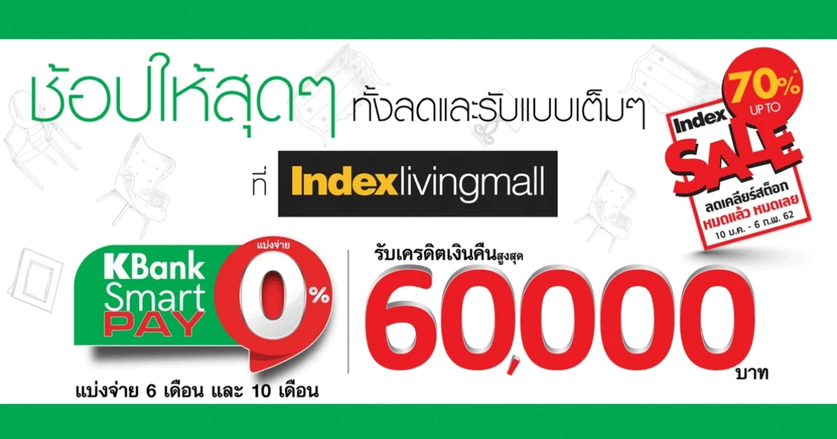 ช้อปให้สุดๆ ทั้งลดและรับแบบเต็มๆ ที่ Index Living Mall กับ บัตรเครดิตกสิกรไทย รับสิทธิ์รับเครดิตเงินคืน สูงสุด 60,000 บาท* เมื่อแบ่งจ่ายผ่านระบบ Smart Pay 0% นานสูงสุด 6 เดือน