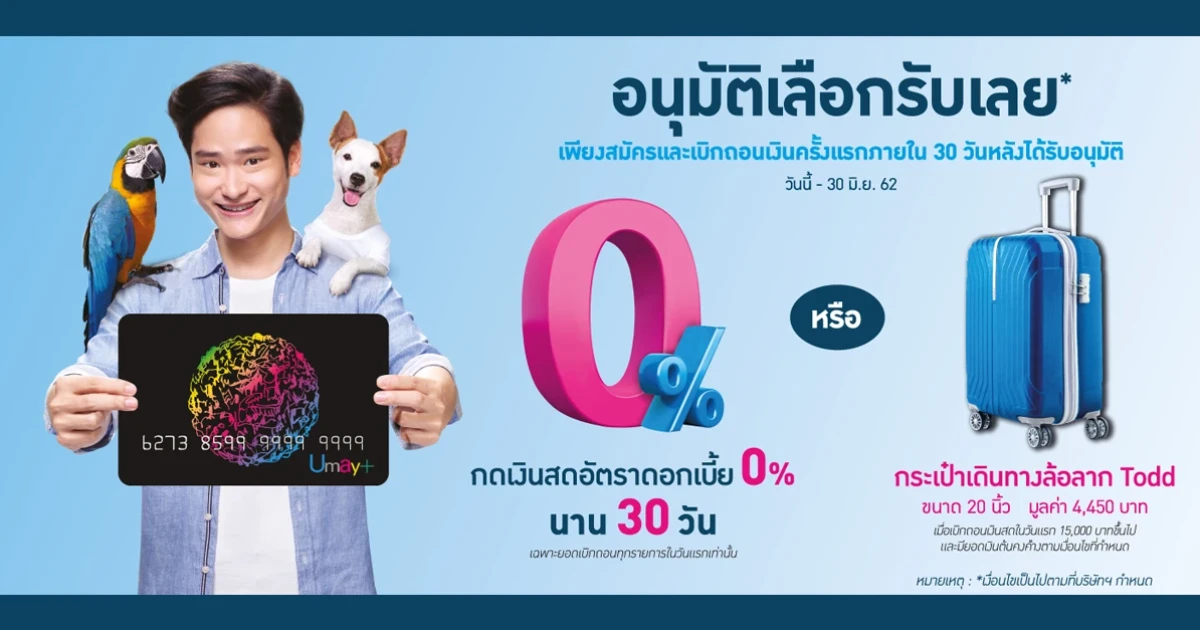 กดเงินสดผ่านบัตรยูเมะพลัสวันนี้ รับดอกเบี้ย 0% นาน 30 วัน หรือเลือกรับกระเป๋าเดินทาง Todd