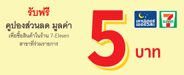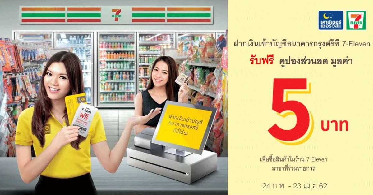 - สิทธิพิเศษเฉพาะลูกค้าที่ทำรายการฝากเงินเข้าบัญชีธนาคารกรุงศรีอยุธยา ที่เคาน์เตอร์เซอร์วิส ในร้าน 7-Eleven ระหว่างวันที่ 24 กุมภาพันธ์ - 23 เมษายน 2562 รับฟรีคูปองแทนเงินสดท้ายใบเสร็จมูลค่า 5 บาท จำนวน 1 ใบ ต่อ 1 รายการ