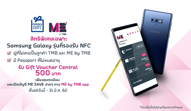 โปรโมชั่นพิเศษสำหรับเจ้าของ Samsung Galaxy 5,000 คนแรก ที่ยังไม่เคยเป็นลูกค้า ME หรือ TMB รับฟรี! Central Gift Voucher 500 บาท เพียงลงทะเบียนรับสิทธิ์ผ่านทาง Samsung Galaxy Gift และเปิด บัญชี ME SAVE ง่ายๆ ผ่าน ME by TMB App แบบไม่ต้องไปสาขา (เฉพาะโทรศัพท์รุ่นที่รองรับฟังก์ชัน NFC เท่านั้น)