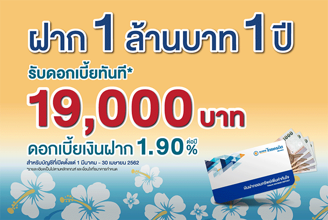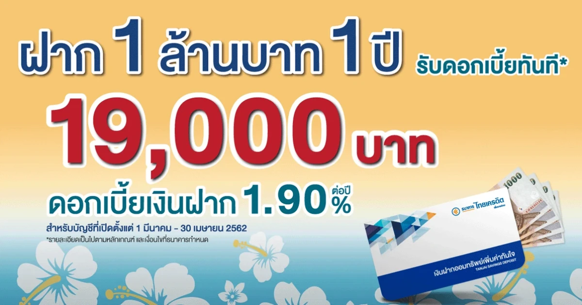โปรโมชั่นเงินฝากออมทรัพย์เพิ่มค่าทันใจ รับดอกเบี้ยทันที รักษายอด 12 เดือน สำหรับลูกค้าบุคคลธรรมดา รับอัตราดอกเบี้ยสูงสุด 1.90% ต่อปี สำหรับผู้ที่เปิดบัญชีเงินฝากออมทรัพย์เพิ่มค่าทันใจ ตั้งแต่ 1 มีนาคม 2562 ถึง 30 เมษายน 2562 เท่านั้น