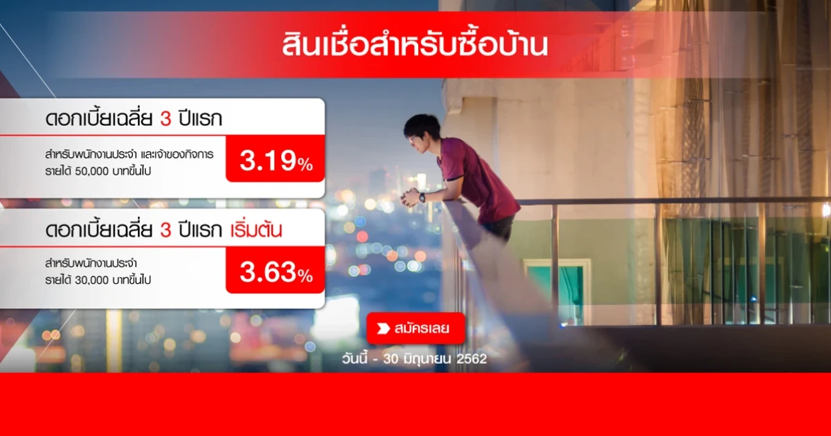 พิเศษ!! ดอกเบี้ยบ้านต่ำสุด 3.19% เฉลี่ย 3 ปีแรก จาก ธนาคาร ซีไอเอ็มบี ไทย วันนี้ - 30 มิ.ย. 62