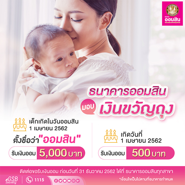 ธนาคารออมสินมอบเงินขวัญถุง สูงสุด 5,000 บาท สำหรับเด็กที่เกิดในวันออมสิน 1 เมษายน 2562
