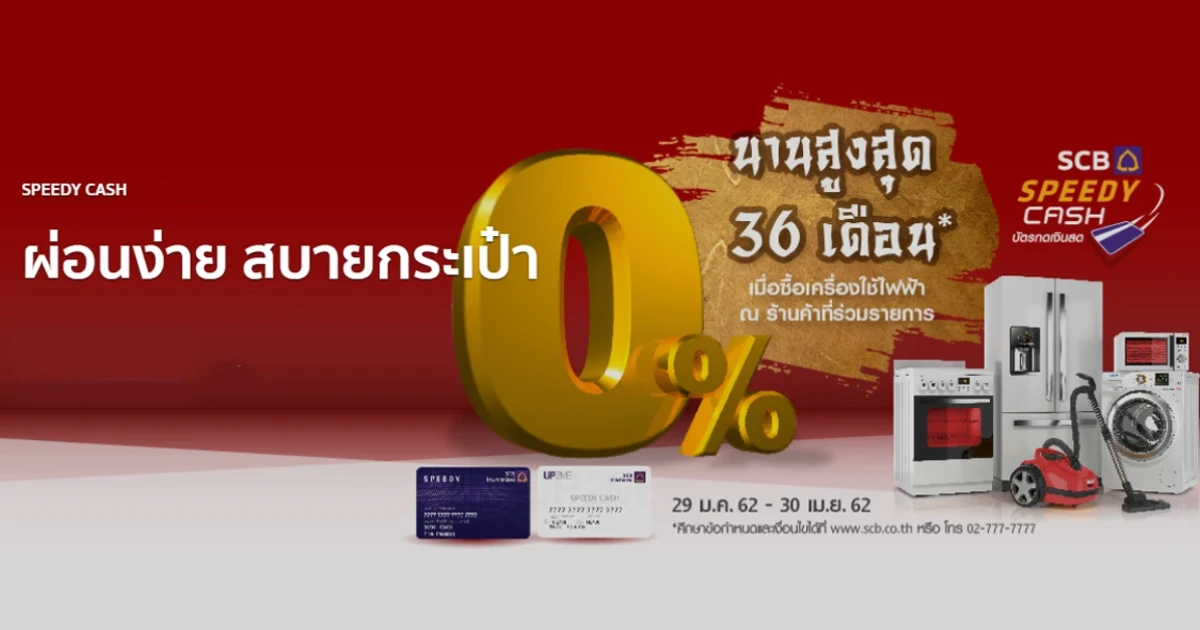 - สิทธิพิเศษสำหรับผู้ถือบัตร Speedy Cash และบัตรอัพทูมี Speedy Cash ธนาคารไทยพาณิชย์ จำกัด (มหาชน) ที่มีหมายเลขบัตร 77777721 xxxxxxxx ผ่อน 0% สูงสุดนาน 36 เดือน เฉพาะสินค้าที่ร่วมรายการที่มียอดแบ่งจ่ายผ่านบัตร Speedy Cash และบัตรอัพทูมี Speedy Cash ตั้งแต่ 29 ม.ค. 62 - 30 เม.ย. 62