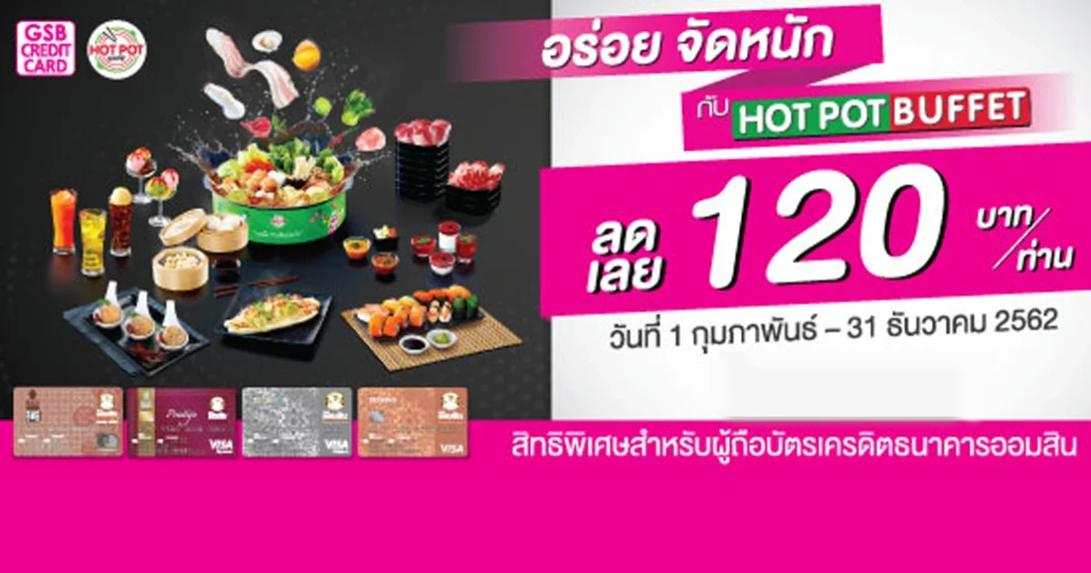 สิทธิพิเศษ! สำหรับลูกค้าบัตรเครดิตธนาคารออมสิน รับส่วนลด 120 บาท/ท่าน เมื่อรับประทานอาหารที่ร้าน Hot Pot Buffet ทุกสาขา วันที่ 1 กุมภาพันธ์ - 31 ธันวาคม 2562