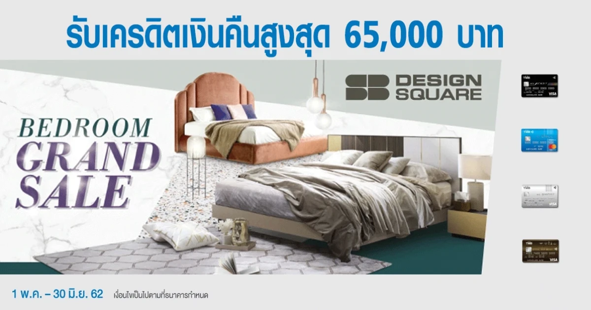 โปรโมชั่นจากบัตรเครดิตทีเอ็มบี - BEDROOM Grandsale รับเครดิตเงินคืนสูงสุด 65,000 บาท เมื่อมียอดชำระเต็มจำนวนที่ SB Design Square ทุกสาขา