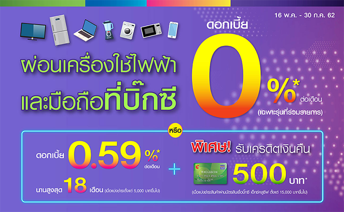 ผ่อนเครื่องใช้ไฟฟ้า หรือโทรศัพท์มือถือ ดอกเบี้ย 0% หรือ 0.59% นานสูงสุด 18 เดือน ที่บิ๊กซี