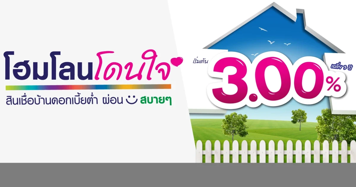 โฮมโลนโดนใจ สินเชื่อบ้านดอกเบี้ยต่ำ ผ่อนสบายๆ เริ่มต้นเฉลี่ย 3 ปี 3.00% ต่อปี