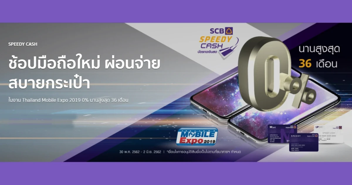 - สิทธิพิเศษสำหรับผู้ถือบัตร Speedy Cash และบัตรอัพทูมี Speedy Cash ธนาคารไทยพาณิชย์ จำกัด (มหาชน) ("ธนาคาร") ที่มีหมายเลขบัตร 77777721 xxxxxxxx ("ผู้ถือบัตร") ผ่อน 0 % สูงสุดนาน 36 เดือน เฉพาะสินค้าที่ร่วมรายการภายในงาน Thailand Mobile Expo เมื่อมียอดแบ่งจ่ายผ่านบัตร Speedy Cash และบัตรอัพทูมี Speedy Cash โดยเมื่อมียอดใช้จ่ายต่อเซลส์สลิปตั้งแต่ 1,200 บาทขึ้นไป รับสิทธิผ่อนชำระนาน 4 เดือน, เมื่อมียอดใช้จ่ายต่อเซลส์สลิปตั้งแต่ 1,800 บาทขึ้นไป รับสิทธิผ่อนชำระนาน 6 เดือน, เมื่อมียอดใช้จ่ายต่อเซลส์สลิปตั้งแต่ 3,000 บาทขึ้นไป รับสิทธิผ่อนชำระนาน 10 เดือน, เมื่อมียอดใช้จ่ายต่อเซลส์สลิปตั้งแต่ 3,600 บาทขึ้นไป รับสิทธิผ่อนชำระนาน 12 เดือน, เมื่อมียอดใช้จ่ายต่อเซลส์สลิปตั้งแต่ 4,500 บาทขึ้นไป รับสิทธิผ่อนชำระนาน 15 เดือน, เมื่อมียอดใช้จ่ายต่อเซลส์สลิปตั้งแต่ 5,400 บาทขึ้นไป รับสิทธิผ่อนชำระ นาน 18 เดือน, เมื่อมียอดใช้จ่ายต่อเซลส์สลิปตั้งแต่ 6,000 บาทขึ้นไป รับสิทธิผ่อนชำระนาน 20 เดือน, เมื่อมียอดใช้จ่ายต่อเซลส์สลิปตั้งแต่ 7,200 บาทขึ้นไป รับสิทธิผ่อนชำระนาน 24 เดือน และเมื่อมียอดใช้จ่ายต่อเซลส์สลิปตั้งแต่ 10,800 บาทขึ้นไป รับสิทธิผ่อนชำระนาน 36 เดือน ตั้งแต่วันที่ 30 พฤษภาคม 2562 - 2 มิถุนายน 2562
