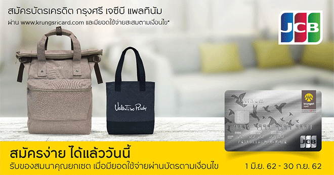 สมัครบัตรเครดิต กรุงศรี เจซีบี แพลทินัม ผ่านช่องทาง www.krungsricard.com และมียอดใช้จ่ายผ่านบัตรครบ 5,000 บาทขึ้นไป ภายใน 30 วัน หลังจากบัตรได้รับการอนุมัติ (ยอดใช้จ่ายสะสมผ่านบัตรไม่นับรวมการซื้อกองทุนรวม, ยอดกดเงินสดหรือยอดบริการเงินด่วนสั่งได้ (Krungsri Call For Cash) และค่าเบี้ยประกันทุกประเภท