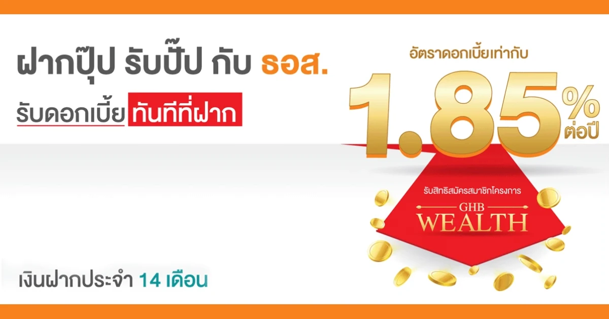 บัญชีเงินฝากประจำ 14 เดือน สำหรับลูกค้าบุคคลธรรมดา และนิติบุคคลทั่วไป ฝากปุ๊บ รับดอกเบี้ยปั๊บ จาก ธอส. รับเปิดบัญชี 1 ราย ต่อ 1 บัญชี
