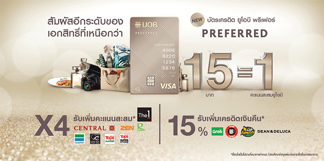 โฉมใหม่!! บัตรเครดิต ยูโอบี พรีเฟอร์ (UOB Preferred Card) สัมผัสอีกระดับของเอกสิทธิ์ที่เหนือกว่า สิทธิพิเศษครบครันในบัตรเดียว นอกจากนี้ยังรับคะแนนสะสมได้ง่ายๆ ทุก 15 บาท รับคะแนนสะสม UOB Reward Plus เท่ากับ 1 คะแนน และยังได้รับเครดิตเงินคืน เมื่อใช้จ่ายผ่านบัตรตามเงื่อนไขของธนาคาร พร้อมรับสิทธิพิเศษอื่นๆ อีกมากมาย ไปลองดูรายละเอียดของตัวบัตรฯ ตามด้านล่างนี้กันเลยค่ะ