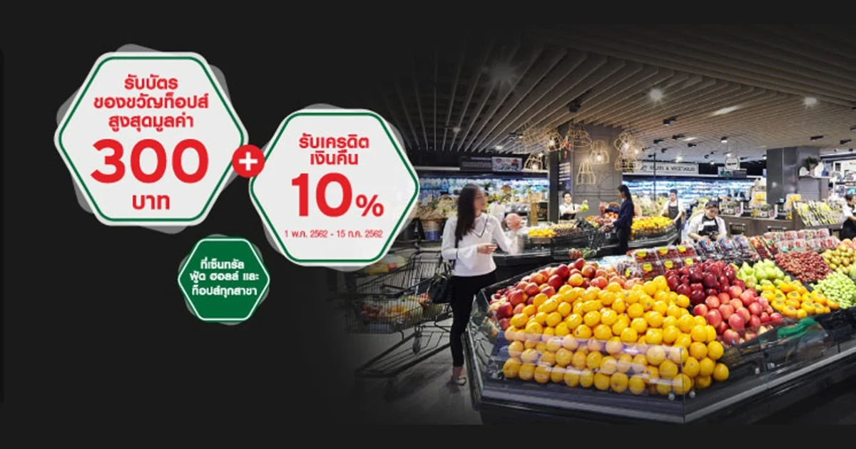 ต่อที่ 1 รับบัตรของขวัญท็อปส์ สูงสุดมูลค่า 300 บาท เมื่อใช้จ่ายผ่านบัตรฯ ทุก 2,000 บาทขึ้นไป/เซลส์สลิป รับบัตรของขวัญท็อปส์มูลค่า 100 บาท (จำกัดบัตรของขวัญท็อปส์สูงสุด 300 บาท/ท่าน/เดือน)