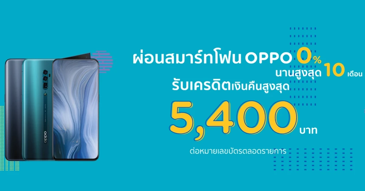 ช้อปสมาร์ทโฟนสุดคุ้ม ผ่อน 0% ที่ OPPO Brand shop รับเครดิตเงินคืนสูงสุด 5,400 บาท >> ผ่อนสมาร์ทโฟน 0% นานสูงสุด 10 เดือน รับเครดิตเงินคืนสูงสุด 5,400 บาทต่อหมายเลขบัตรตลอดรายการ เมื่อมียอดผ่อนชำระ (ต่อเซลส์สลิป) เฉพาะผ่อน 4 เดือนขึ้นไป ดังนี้