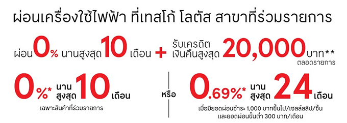 - 0.69% นานสูงสุด 24 เดือน สำหรับผ่อนชำระเครื่องใช้ไฟฟ้าและมือถือ ราคา 1,000 บาทขึ้นไป/เซลล์สลิป/ชิ้น และมียอดผ่อนขั้นต่ำ 300 บาท/เดือน