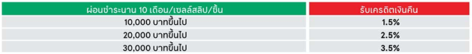- ยอดผ่อนชำระ 10,000 ขึ้นไป/เซลล์สลิป/ชิ้น นาน 10 เดือนขึ้นไป รับเครดิตเงินคืน 1.5%