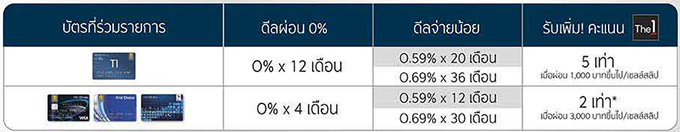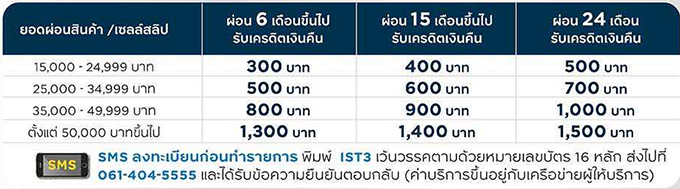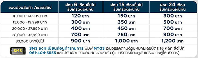 - ยอดเครดิตเงินคืนจะคำนวณยอดแบ่งจ่ายตั้งแต่ 10,000 บาทขึ้นไป / เซลล์สลิป และผ่อนชำระนาน 6 เดือนขึ้นไป