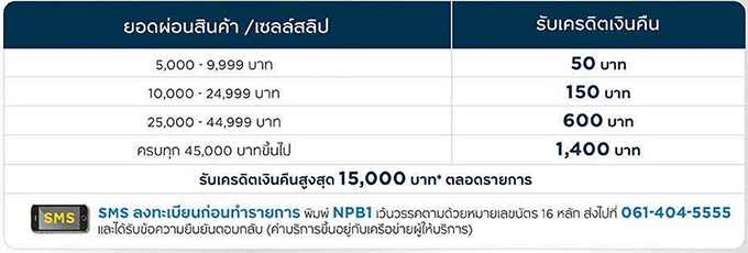 - บริษัทฯ ขอสงวนสิทธิ์ในการเครดิตเงินคืนเฉพาะสมาชิกบัตรที่ยังคงสภาพสมาชิกและมีประวัติการชำระดีจนถึงวันที่มีการเครดิตเงินคืนในรอบบัญชีของท่าน