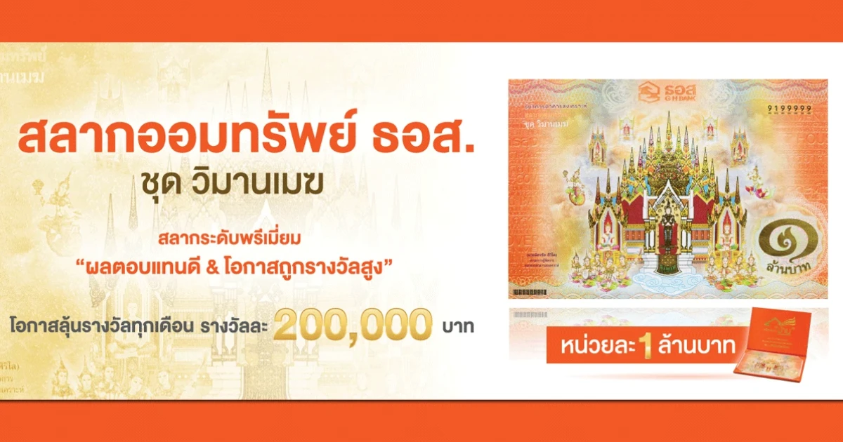 นอกจากนี้ ธนาคารอยู่ระหว่างประสานความร่วมมือกับสำนักงานสลากกินแบ่งรัฐบาลในเรื่องกระบวนการออกรางวัลที่กำหนดจัดขึ้นทุกวันที่ 16 ของเดือน เพื่อสร้างความมั่นใจในด้านความโปร่งใสในการออกรางวัลแก่ประชาชน โดยสลากออมทรัพย์ ธอส. ชุดวิมานเมฆ มีอายุสลาก 3 ปี ผลตอบแทนเมื่อฝากครบ 3 ปี จะได้รับเงินต้นพร้อมดอกเบี้ยหน่วยละ 42,000 บาท หรือคิดเป็น 1.40% ต่อปี ผู้ซื้อสลากยังได้ลุ้นรางวัลทุกวันที่ 16 ของเดือน แบ่งเป็นรางวัลละ 200,000 บาท จำนวน 27 รางวัล/เดือน หรือตลอดอายุสลาก 3 ปี จะได้ลุ้นรางวัลถึง 36 ครั้ง รวม 972 รางวัล เป็นจำนวนเงินรางวัลรวมถึง 194.4 ล้านบาท คิดเป็นโอกาสในการถูกรางวัลสูงถึง 0.1% กรณีถูกรางวัล ธนาคารจะโอนเงินรางวัลเข้าบัญชีเงินฝากออมทรัพย์รับโชคในวันถัดจากวันที่มีการออกรางวัลในแต่ละครั้ง หากถูกรางวัลผลตอบแทนเฉลี่ยต่อปีจะเพิ่มขึ้นต่อเนื่อง อาทิ ถูกรางวัล 1 ครั้ง ผลตอบแทนเฉลี่ยจะอยู่ที่ 8.07% ต่อปี ถูกรางวัล 2 ครั้ง ผลตอบแทนเฉลี่ย 14.73% ต่อปี หรือถูกรางวัล 5 ครั้ง ผลตอบแทนเฉลี่ยจะสูงถึง 24.73% ต่อปี และเมื่อครบ 3 ปี ยังสามารถเลือกที่จะถือสลากต่อเพื่อรับผลตอบแทนตามที่ธนาคารกำหนดหรือมอบเป็นมรดกได้