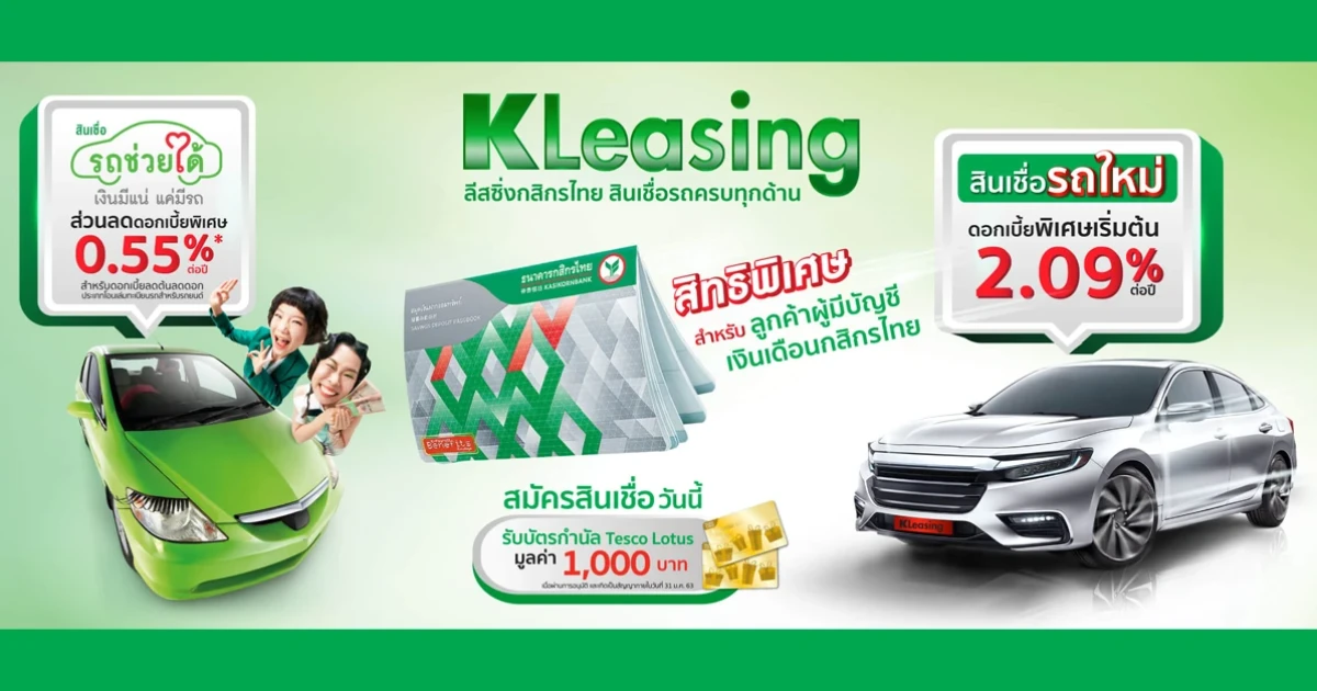 - การพิจารณาเครดิต หลักเกณฑ์และเงื่อนไขอื่นๆ เป็นไปตามที่บริษัท ลีสซิ่งกสิกรไทย จำกัด กำหนด และบริษัทฯ ขอสงวนสิทธิในการเปลี่ยนแปลงหลักเกณฑ์และเงื่อนไขตามที่เห็นสมควรโดยมิต้องแจ้งให้ทราบล่วงหน้า