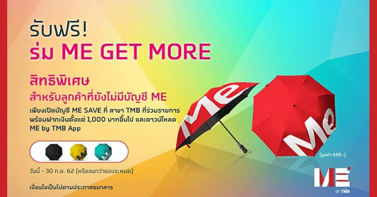 พิเศษ! สำหรับลูกค้าใหม่ที่ยังไม่เคยเป็นลูกค้า ME เพียงนำบัตรประชาชน และสมุดบัญชีออมทรัพย์ธนาคารใดก็ได้ที่เป็นชื่อคุณ มาเปิดบัญชี ME SAVE พร้อมฝากเงินตั้งแต่ 1,000 บาทขึ้นไป และดาวน์โหลด ME by TMB App ที่สาขา TMB ที่ร่วมรายการ รับฟรี!! ร่ม ME GET MORE มูลค่า 699 บาท