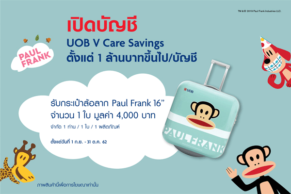 สำหรับลูกค้าใหม่ที่เปิดบัญชีเงินฝากออมทรัพย์ยูโอบี วีแคร์ (UOB Vcare) กับธนาคารยูโอบี และคงยอดเงินฝาก 1 ล้านบาทเป็นต้นไป ติดต่อกันตามระยะเวลาที่กำหนด จะได้รับ Paul Frank Trolley Bag 16 นิ้ว จำนวน 1 ชิ้น มูลค่า 4,000 บาท
