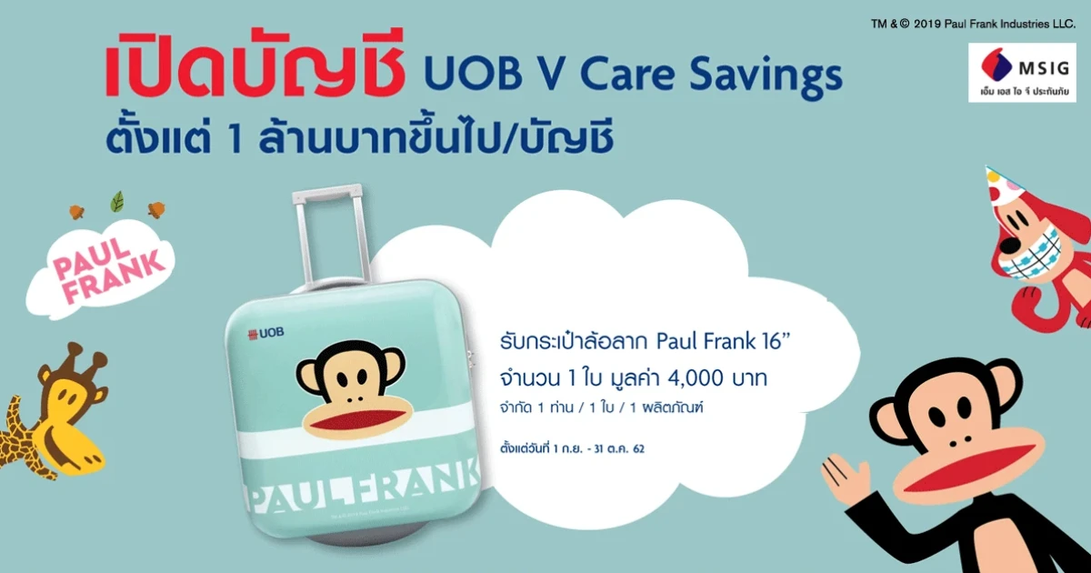 สำหรับลูกค้าใหม่ที่เปิดบัญชีเงินฝากออมทรัพย์ยูโอบี วีแคร์ (UOB Vcare) กับธนาคารยูโอบี และคงยอดเงินฝาก 1 ล้านบาทเป็นต้นไป ติดต่อกันตามระยะเวลาที่กำหนด จะได้รับ Paul Frank Trolley Bag 16 นิ้ว จำนวน 1 ชิ้น มูลค่า 4,000 บาท
