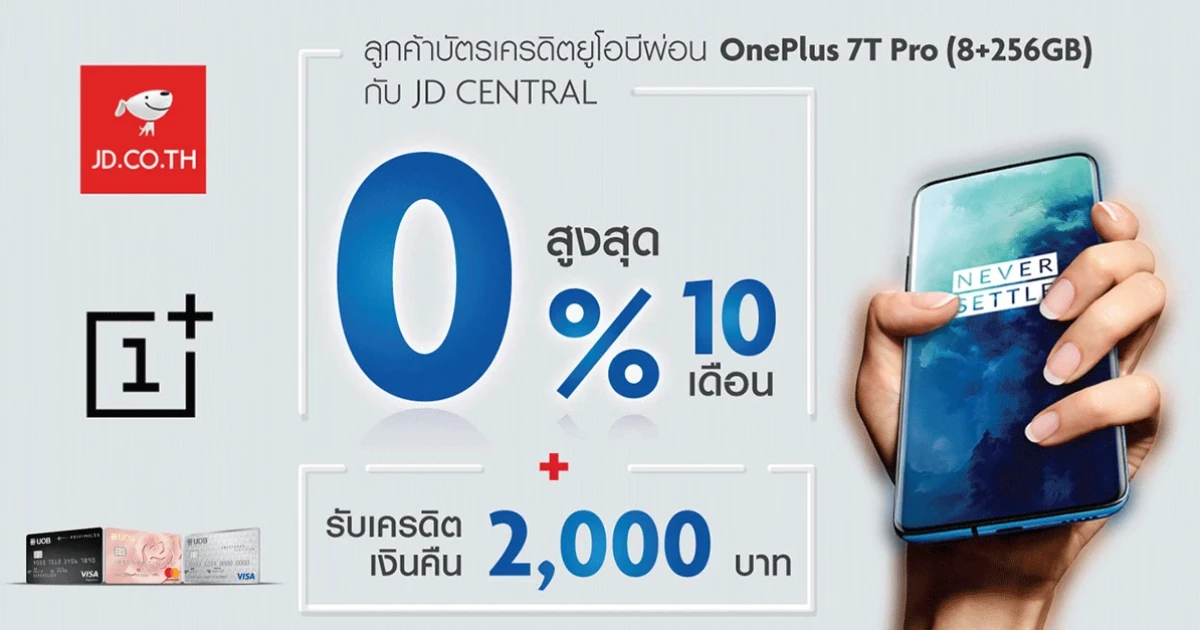 - รายการส่งเสริมการขายนี้ สำหรับการสั่งซื้อแบบผ่อนชำระ Oneplus 7T Pro (8+256) ระหว่างวันที่ 17 -31 ตุลาคม 2562 เฉพาะผู้ถือบัตรเครดิตธนาคารยูโอบีทุกประเภท ที่ออกในประเทศไทยเท่านั้น (ยกเว้นบัตรเครดิตเพื่อธุรกิจ และบัตร TMRW) เมื่อชำระค่าสินค้าผ่านบริการผ่อนชำระแบบ UOB i-Plan ผ่านช่องทาง JD Central Application ประเทศไทย