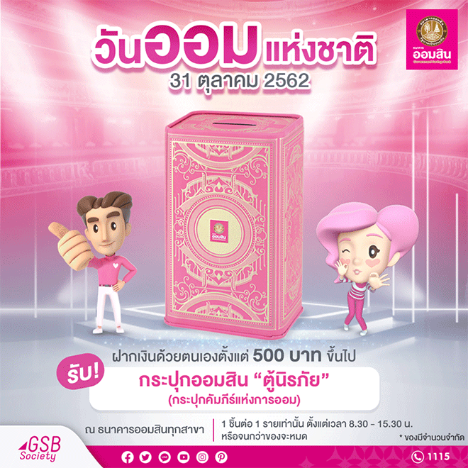 ฝากเงินตั้งแต่ 500 บาทขึ้นไป ในวันออมแห่งชาติ ที่ธนาคารออมสินทุกสาขา รับกระปุกออมสิน "ตู้นิรภัย"