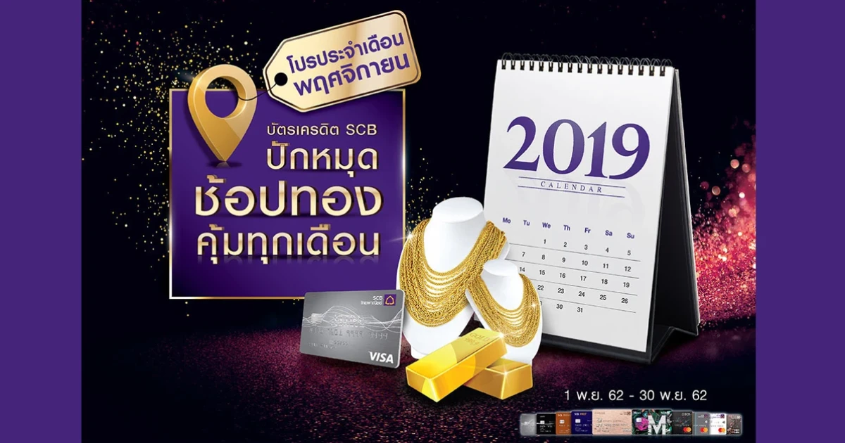 - สิทธิพิเศษนี้สำหรับผู้ถือบัตรเครดิตไทยพาณิชย์ ทุกประเภท เมื่อซื้อทองคำรูปพรรณ โดยแบ่งจ่ายกับ ห้างเพชรทองออโรร่า, ห้างทองบางกอก โกลด์ส, บริษัท โกลด์มาร์ค จำกัด, ห้างทองแม่ทองสุก, ห้างเพชรทอง ง้วน เซ่ง เฮง เยาวราช (NGG), ห้างทองเยาวราชกรุงเทพ, ห้างทองเยาวราช ห้างทองเยาวราชออมทอง, ห้างทองหวังโต๊ะกังเยาวราช ห้างทองอยากมีตัง ห้างทองเยาวราชทองดี, บริษัท วายแอลจี พรีเซียส จำกัด ระหว่างวันที่ 1 - 30 พ.ย. 62
