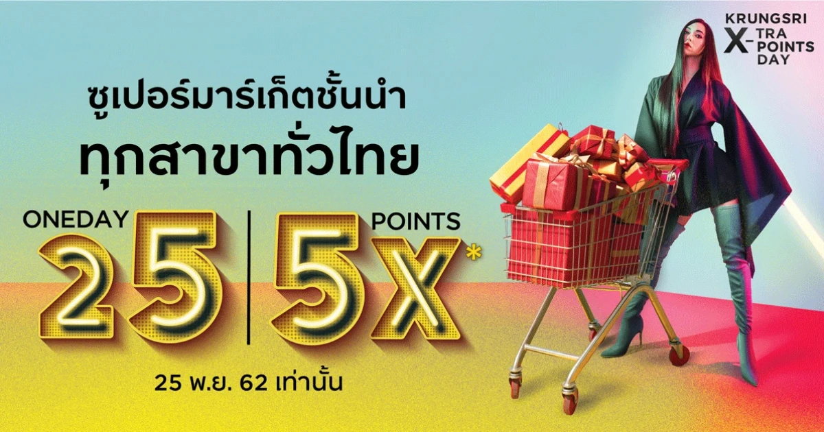 25 พ.ย. 62 วันเดียวเท่านั้น KRUNGSRI X-TRA POINTS DAY ลูกค้าบัตรเครดิต กรุงศรี รับพอยต์รวมสูงสุด 5X* เมื่อช้อปครบทุก 1,500 บาท/เซลล์สลิป ที่ซูเปอร์มาร์เก็ตที่ร่วมรายการชั้นนำ ทั่วไทย