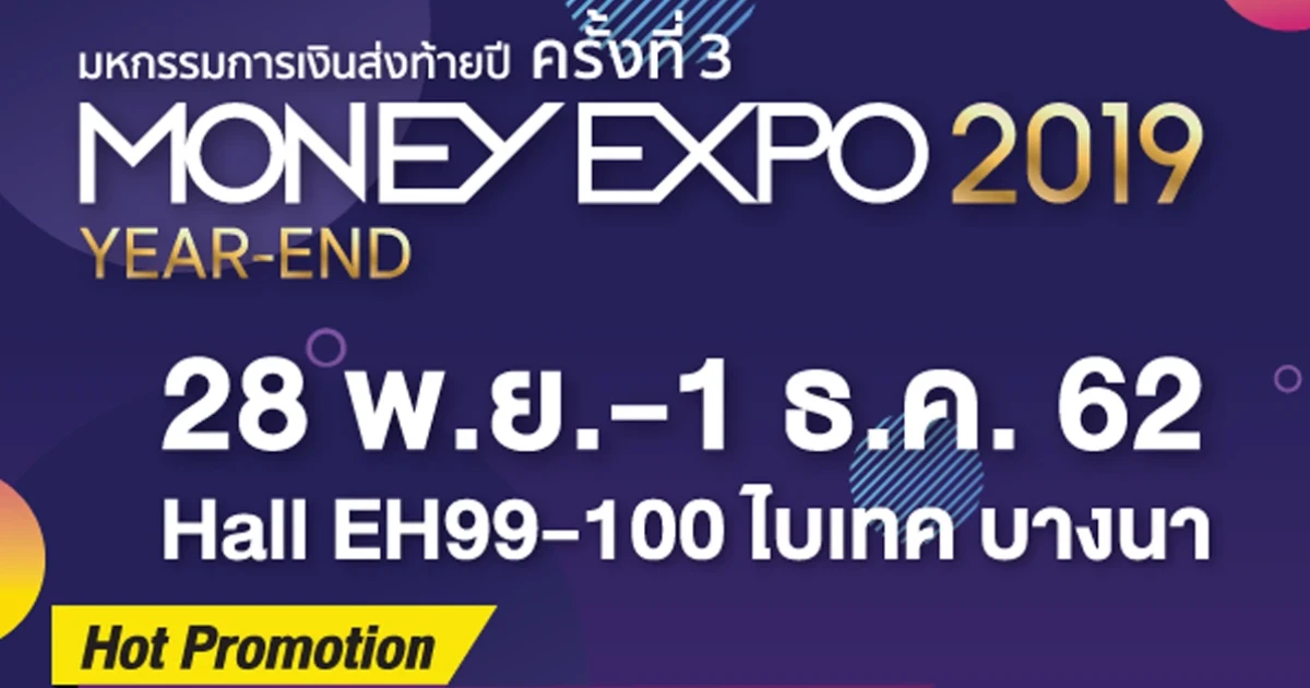 งานมหกรรมการเงินส่งท้ายปี ครั้งที่ 3 Money Expo Year-End 2019 แบงก์/นอนแบงก์/ประกัน/บล./บลจ. แข่งแคมเปญแรงโค้งสุดท้ายแห่งปี กู้บ้าน/รีไฟแนนซ์บ้าน ดอกเบี้ย 0% 6 เดือน เงินฝากเผื่อเรียกพิเศษ ดอกเบี้ยแบบขั้นบันไดสูงสุด 10% สินเชื่อ SME Start Up ดอกเบี้ย 1.99% โค้งสุดท้าย! ซื้อประกันชีวิตแถมทองคำแท่ง 20 บาท/ทัวร์โครเอเชีย กองทุน RMF & LTF ลดหย่อนภาษีและอีกมากมาย