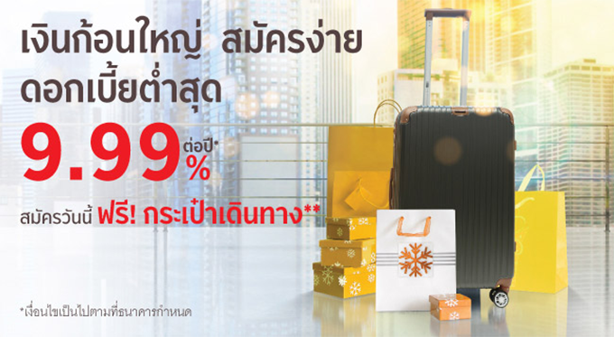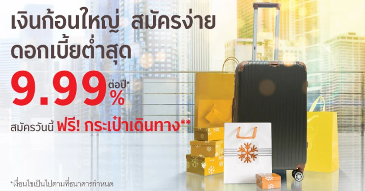 สินเชื่อหมุนเวียนส่วนบุคคลดอกเบี้ยต่ำสุด 9.99% สมัครวันนี้...ฟรี! กระเป๋าเดินทาง จาก ธ.กรุงศรีฯ