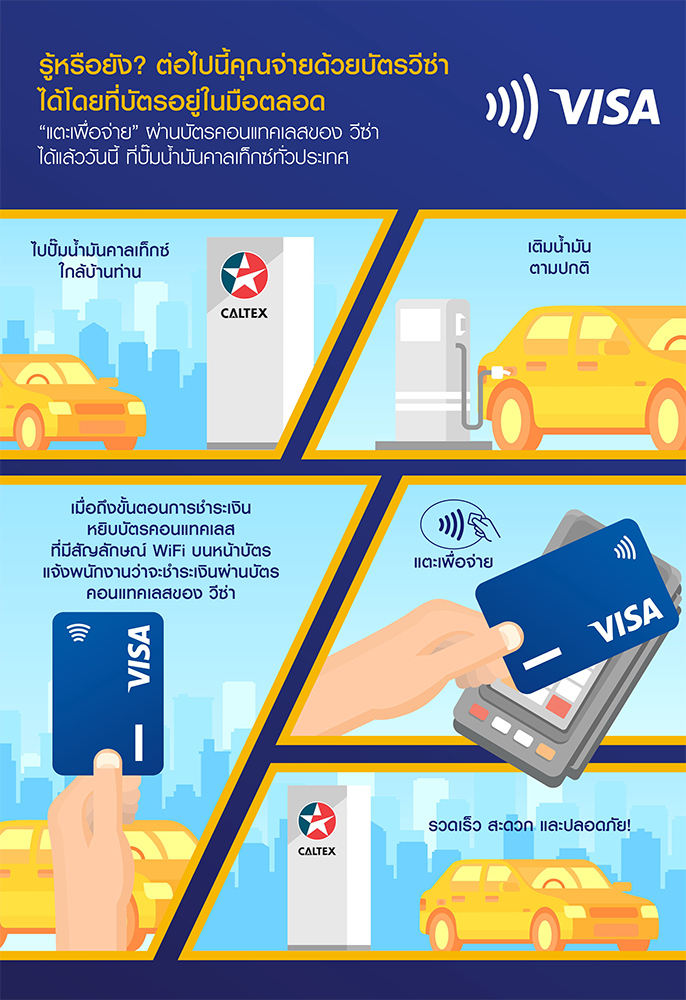 วีซ่า ผู้ให้บริการด้านการชำระเงินในรูปแบบดิจิทัลชั้นนำระดับโลก ประกาศความร่วมมือกับ คาลเท็กซ์ เปิดรับการชำระเงินผ่านบัตรคอนแทคเลสเป็นครั้งแรกในประเทศไทย ผู้ที่ใช้บริการในปั๊มคาลเท็กซ์สามารถชำระเงินผ่านการ "แตะ เพื่อจ่าย"และไม่ต้องยื่นบัตรชำระเงินของตนเองให้พนักงานปั๊ม กว่า 370 สาขาทั่วประเทศ