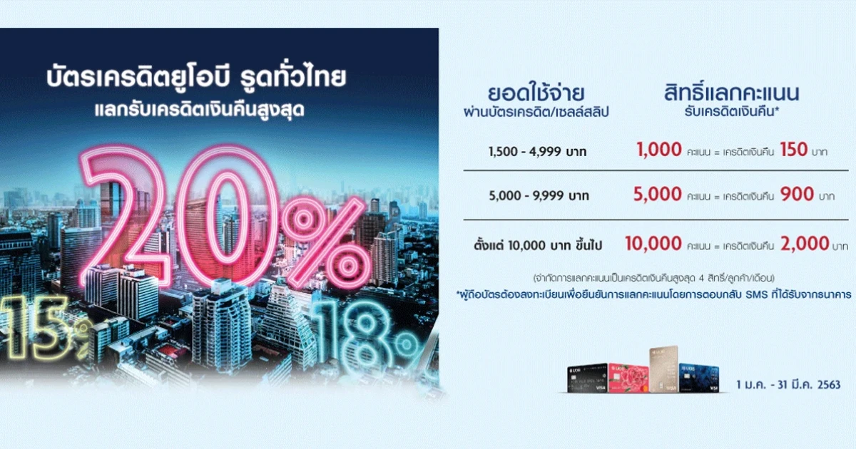 บัตรเครดิตยูโอบี รูดทั่วไทย แลกรับเครดิตเงินคืนสูงสุด 20%